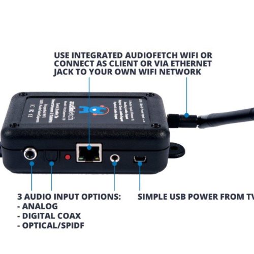 The AudioFetch Express features built in WiFi and can operate stand alone. Great for installations that don’t have an existing WiFi system.