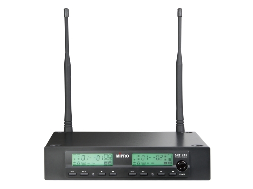 > ACT312B MIPRO Dual Channel Diversity Receiver. 1/2 RU metal rackmountable receiver. 961 selectable frequecies, removable antenna, Independant XLR and 6.35mm jack outputs and selectable jack mixed output. Features Auto Scan and ACT for one-button frequency sync to transmitters. Single and Dual rack kits available